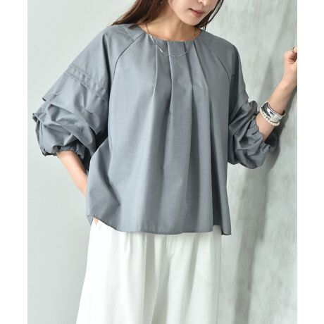 ゆったり着られるシルエットのホイップスリーブブラウス。女性らしい曲線のラウンドネックと、袖にデザインされたタックで1枚でも旬な着こなしに決まります。ブラウスを主役にしたコーディネイトがおススメです。シンプルなボトムを合わせるだけでカジュアル過ぎず大人なスタイリングが決まります。