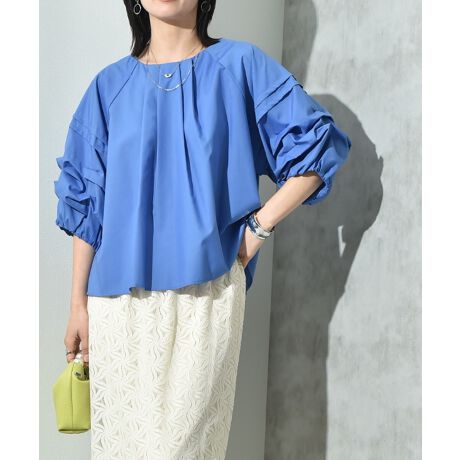ゆったり着られるシルエットのホイップスリーブブラウス。女性らしい曲線のラウンドネックと、袖にデザインされたタックで1枚でも旬な着こなしに決まります。ブラウスを主役にしたコーディネイトがおススメです。シンプルなボトムを合わせるだけでカジュアル過ぎず大人なスタイリングが決まります。