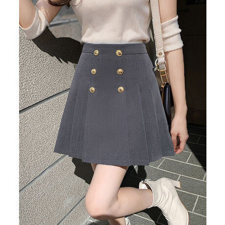 トラッドな雰囲気を演出するフロントボタン付きのプリーツスカート。