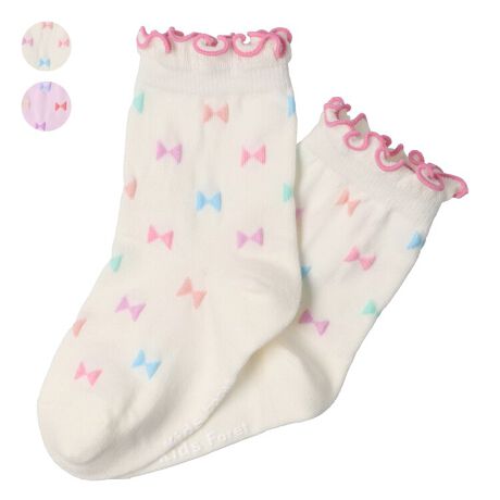 靴下は送料合わせにもオススメなアイテム。対応サイズは14cm(13〜15cm)、17cm(16〜18cm)、20cm(19〜21cm)です!履き口のメローがポイントのリボン柄クルーソックス、靴下。【アイテム】 雑貨 カジュアル お洒落 オシャレ かわいい 可愛い 普段着 デイリーウェア お出かけ 子ども こども 女児 女の子 ガールズ キッズ ベビーサイズ トドラーサイズ 幼稚園 保育園 小学校 通園 通学 小学生 遠足 旅行 2025年春夏物新作 丸高衣料 小物 オフホワイト 白色 ラベンダー 薄紫色 りぼん キッズフォーレ
