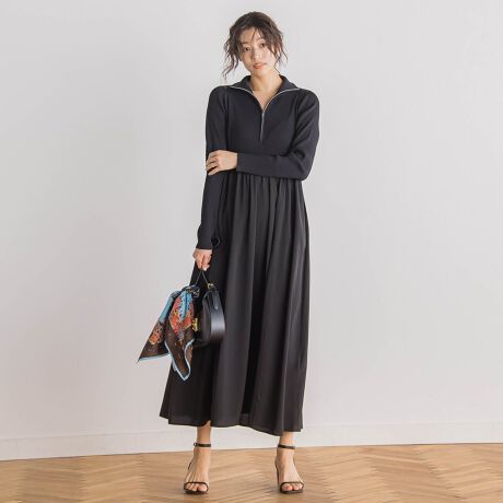 ハーフジップの襟デザインが効いたドッキングワンピース。