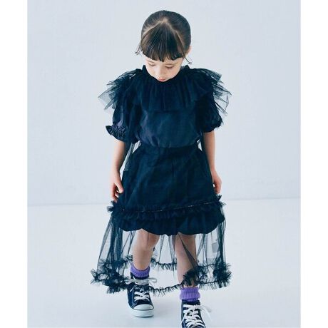 大胆なチュール使いが目を惹く、チュールフリルレイヤードワンピース。Tシャツとパンツの上などに着用して、インナーを透けさせるコーディネートを楽しむ主役級アイテム。きょうだいやおともだちとおそろいにして、リンクコーデをたのしむのもおすすめ。p.premierならではの、まわりと差がつく一着です。