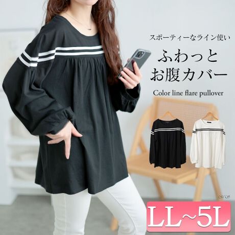【大きいサイズ】 配色ラインフレアプルオーバー 大きいサイズ レディース トップス カットソー 長袖