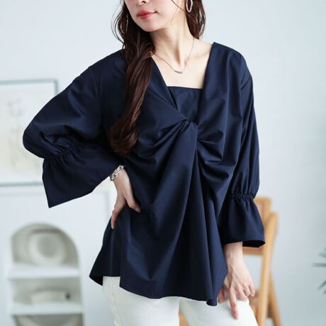 女性らしさを高める、バックタックツイストブラウス。立体的なツイストデザインが胸元から裾にかけて美しいシルエットを演出し、ふんわりとお腹周りを自然とカバーしてくれます。バックタックを施し、後ろ姿までお洒落&スッキリ見え。さらりとした生地感で着心地良く、見た目にも上品な質感。キレイめな印象でオンにもオフにも活躍してくれるアイテムです。