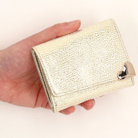 [型番:10989]ハートの金具をアクセントにしたアシンメトリーなフラップ 甘さを抑えた、コンパクトな形になっています。ボックスコイン入れの仕様で小銭が取り出しやすく本体もコンパクトに仕上げた三つ折り。カードポケット 4 / 札入1 / BOX小銭入1 / 内ポケット2/外ポケット1