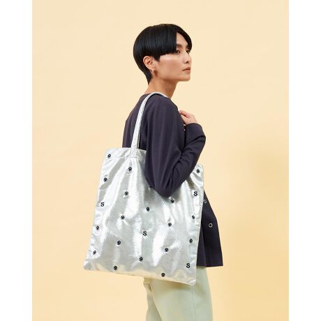 メタリック生地にドット柄のようにちりばめられたSMILEYフェイスと頭文字の「S」の刺繍が最高にかわいい万能バッグです。