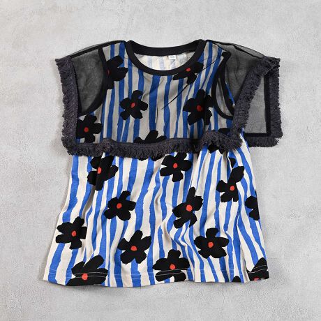 チュール素材にフリンジをMIXしたスクエアカラーが目を引きます。