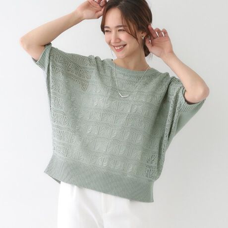 前身頃は爽やかで清涼感あるレース柄のような透かし編み。
