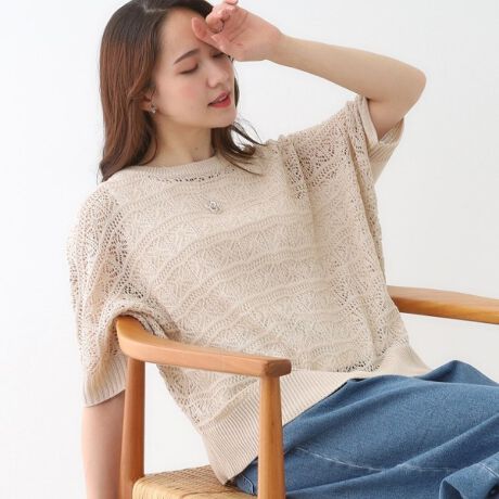 前身頃は爽やかで清涼感あるレース柄のような透かし編み。