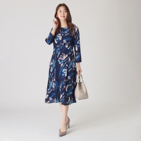 変形フラワープリント柄が目を惹くワンピース。