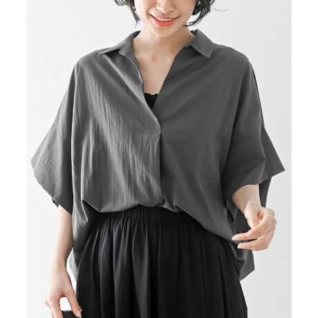 スキッパーカラーが抜け感のある女性らしい装いを演出するシャツブラウス。