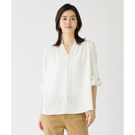 【2025春 セレモニー 卒園式 卒業式 入園式 入学式 フォーマル ハレの日】顔まわりが華やぐスタンドカラーのブラウス。胸元にかけてのネックラインが立体的なシルエットを作り、一枚でもサマになります。生地は程良い反発感と落ち感が特徴で、肌離れのよいさらっとした風合いです。肩に施したギャザーがポイントになり、ジャケットのインナーとして着用した際にも女性らしい華やかさを演出します。・水洗い可■素材■ソフトな風合いのバックサテン梨地ジョーゼット。特殊加工を施す事で、ナチュラルなストレッチ性と反発感がプラスされ、着心地の良さと上質感がアップしています。透けにくく、シワになりにくいイージーケア性、UVカット・吸水速乾・接触冷感効果等の機能を併せ持った素材です。■サンプル撮影商品■こちらの商品はサンプルでの撮影となっております。実際の商品とは、サイズや色味、素材、デザイン等の仕様が若干変更になる場合がございます。