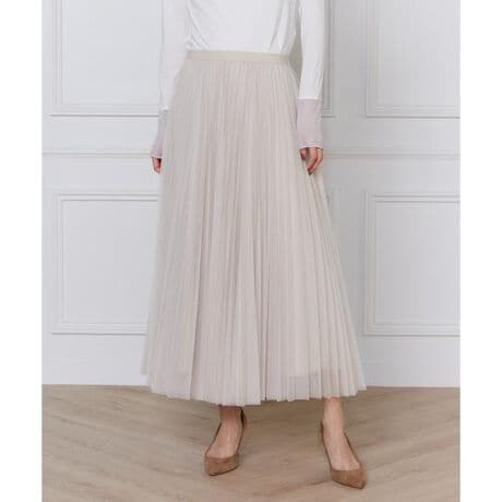 軽やかなチュールのプリーツスカート。細幅のプリーツが上品でシャープな印象です。内側にもチュールを重ねることで程よくボリュームを出しています。ウエストはゴム仕様で穿き心地良く、きれいめからカジュアルまで幅広いスタイリングを楽しめるアイテムです。裏地との境目に透け感があることで軽さが出て、抜け感のある着こなしが完成します。・裏地あり・ウエストゴム仕様■サンプル撮影商品■こちらの商品はサンプルでの撮影となっております。実際の商品とは、サイズや色味、素材、デザイン等の仕様が若干変更になる場合がございます。