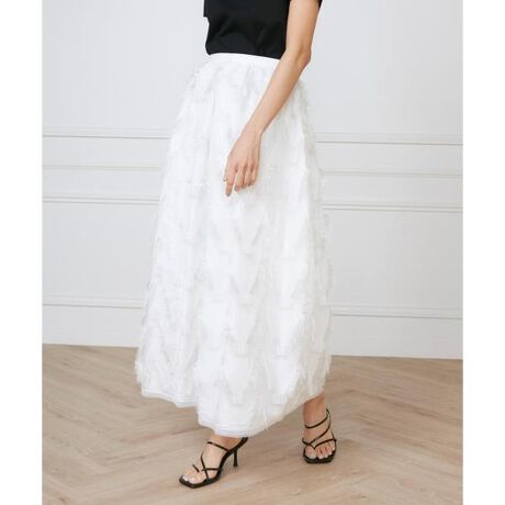 細かいタックを寄せてからギャザーにすることで全体にボリューム感を出し、動くと広がる様子がなんともエレガントなスカート。通常のカットジャガードとは違い、ほぼ手作業による複雑なカットが特徴で、羽のような柄を立体的に表現しました。裾部分にはオーガンジーテープでトリミングし、裾は繊細な透け感がエアリーな印象です。ブラウスを合わせたシックなスタイルはもちろん、タイトなニットとのコーディネートでレディにするなど、幅広いスタイリングに活躍してくれるアイテムです。・ペチコート付き■下げ札サイズ表記1=(S/7号)2=(M/9号)3=(L/11号)■サンプル撮影商品■こちらの商品はサンプルでの撮影となっております。実際の商品とは、サイズや色味、素材、デザイン等の仕様が若干変更になる場合がございます。