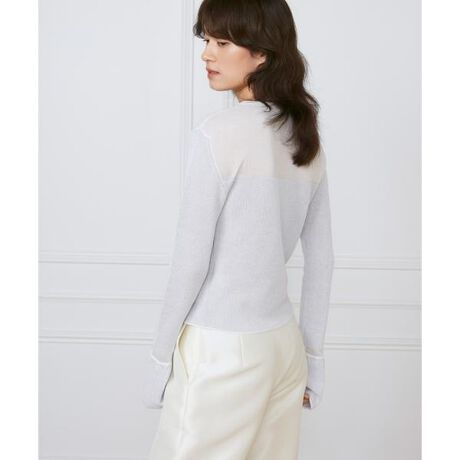 異素材をドッキングさせた畦編みニット。ボディーはコットン糸とメタリックヤーンを掛け合わせて編み立てた、コントラストのあるストライプ見えする編地。胸パーツとお袖パーツにはシアー素材を使用し、春らしい印象です。クロップド丈でボトムとのバランスも取りやすいサイジングに仕上げております。1枚で印象的なデザインニットです。モノづくりにおけるクラフトマンシップとプライドを感じる、イタリアの工場cashartで丁寧に編立てました。・水洗い可■下げ札サイズ表記2=(M/9号)《casheart/カシアート》1952年にフィレンツェ郊外で誕生したニットブランド。ハイクオリティな天然素材を使用し、自社工場で企画からデザイン、製造までを行うMade in Italy商品。“Art of cashmere”をテーマにした上質なカシミヤで織られたプロダクトは、至極の肌触りと着心地。■サンプル撮影商品■こちらの商品はサンプルでの撮影となっております。実際の商品とは、サイズや色味、素材、デザイン等の仕様が若干変更になる場合がございます。