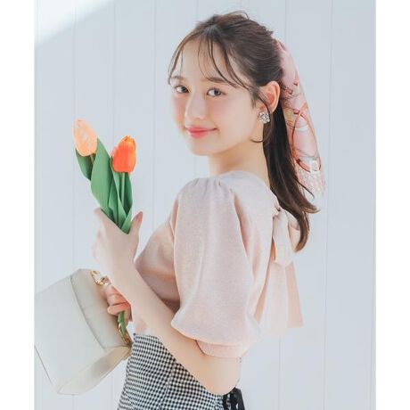 バックリボンがワンポイント♪ 前後2WAYで楽しめるラメニットプルオーバー【Design】・シャイニー感のある半袖ラメニットトップス。・どちらを前にしてもご着用いただける2WAYデザインです。・袖口や裾はキュッと絞ったリブ仕立てのデザインで、ふんわりとした丸みのあるシルエットを演出してくれます♪・リボンは共地で作ることでガーリー過ぎない印象に仕上げました。・春などにも着やすい薄手のニットを使用した着回ししやすいアイテム!・伸縮性があり、動きやすく着脱ぎも楽々です♪【Fabic】・ほんのりとシャリ感のあるラメニットを使用。・ご自宅でお手入れが出来るのも嬉しいポイント♪・ホワイト、オレンジ、ピンクベージュ、ブラックの4色展開となります。【Care】手洗い可能