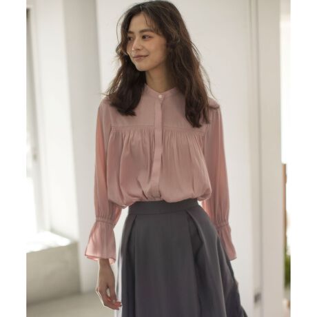 ■デザインバンドカラーの比翼開きブラウスです。落ち感のある素材の特徴を生かした胸元のゴムシャーリングと袖口の幅広のスリットいりキャンディースリーブがエレガントです。袖口にはゴムが入っているのでブラウジングして袖を短くしてボリューム袖としても楽しめる2WAYスリーブ。アウトしても長すぎずスッキリ着られます。