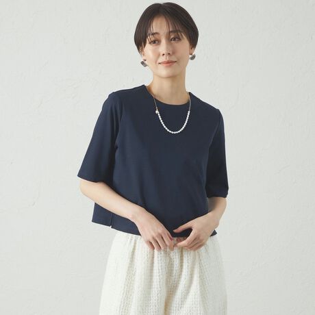 クロップド丈のきれいめTシャツ。身幅はボクシーなシルエットです。