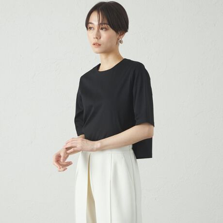 クロップド丈のきれいめTシャツ。身幅はボクシーなシルエットです。