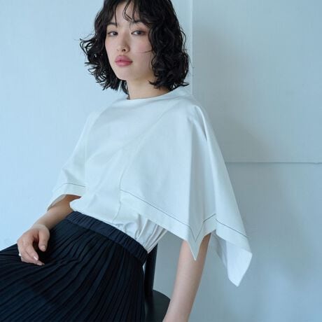 袖のデザインが特徴的なカットソー。スカーフのようなデザインで袖をしっかりカバーしてくれます。