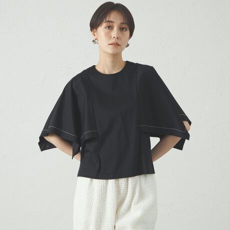 袖のデザインが特徴的なカットソー。スカーフのようなデザインで袖をしっかりカバーしてくれます。