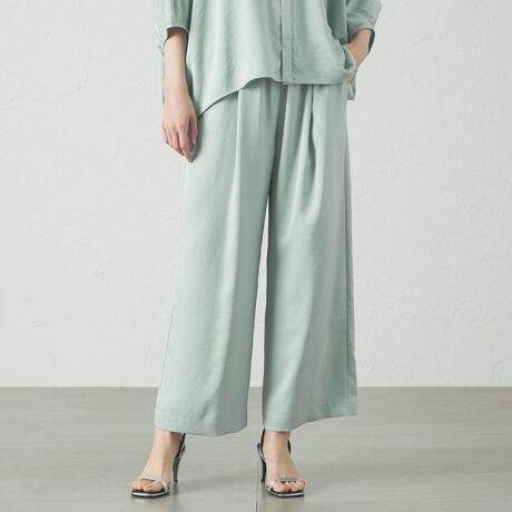 光沢感のある素材を使用し、トレンド感のある大きめタックを入れた、ワイドストレートパンツ。