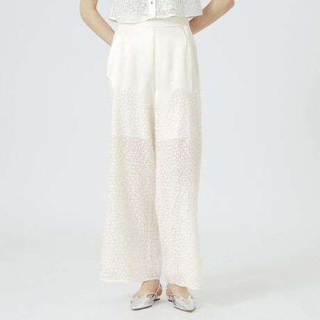 華やかなフェザースパンコールが目を引くワイドパンツ