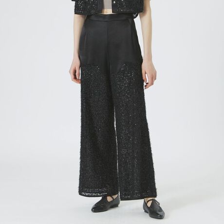 華やかなフェザースパンコールが目を引くワイドパンツ