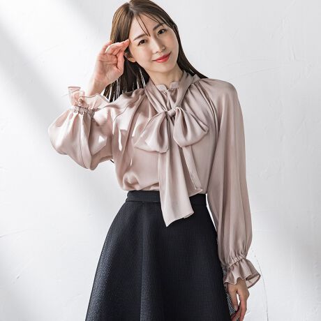 サテン楊柳ボウタイブラウス≪洗濯機で洗える≫