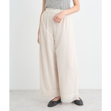 いつものスタイリングを格上げしてくれるシアーアイテム。ストレートなセミワイドボトムにチュールパンツを重ねたレイヤードスタイルがポイントです。それぞれ単体利用もできるセパレートタイプで着回し力が抜群。ウエストゴム仕様で着脱しやすく、