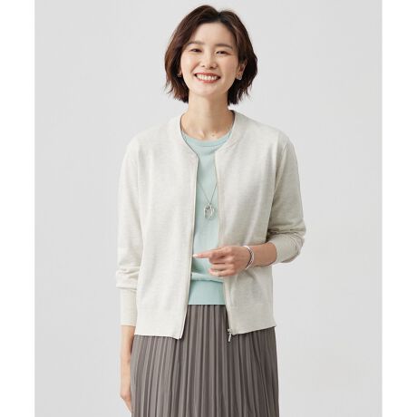 ■デザインニットで編み立てた軽さが特徴のブルゾンタイプのカーディガン。レングスを短めにアップデートしました。素材にストレッチ性があるので、体に程よくなじみ、動きやすくストレスフリーな着心地に仕上げました。シンプルですっきりとしたデザインなので様々なアイテムともスタイリングしやすいアイテムです。