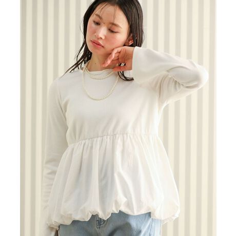リブ素材とややハリ感のある素材をドッキングしたプルオーバー。ウエスト位置で切り替えたふんわりとしたバルーン裾がフェミニンな印象です。程よくボディフィットするサイズ感ながら、伸縮性のある生地で快適な着心地。合わせ方次第でオン・オフどちらでも活躍するおすすめのアイテムです。透け感[ややあり]