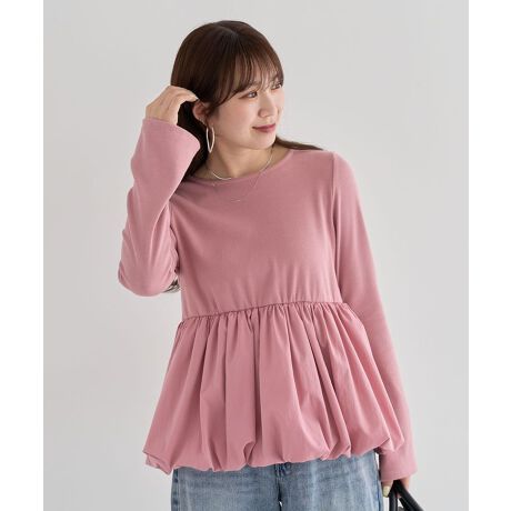 リブ素材とややハリ感のある素材をドッキングしたプルオーバー。ウエスト位置で切り替えたふんわりとしたバルーン裾がフェミニンな印象です。程よくボディフィットするサイズ感ながら、伸縮性のある生地で快適な着心地。合わせ方次第でオン・オフどちらでも活躍するおすすめのアイテムです。透け感[ややあり]