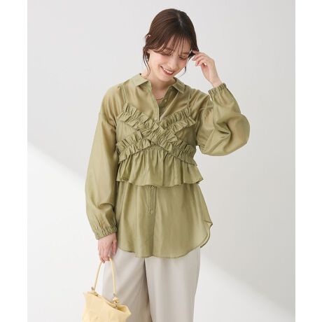 前後差のあるシンプルなシャツと、クロスしたフリルがポイントになった短丈ビスチェのセットアイテム。さらりと軽いシアー素材をゆったりシルエットで仕立てたラフな着心地が魅力の1枚です。ビスチェにはバッグシャーリングを施しメリハリをプラス。セットではもちろん単品使いも出来、ベーシックからトレンドスタイルまで着こなせるおすすめのアイテムです。透け感[あり]