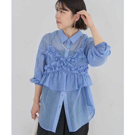 前後差のあるシンプルなシャツと、クロスしたフリルがポイントになった短丈ビスチェのセットアイテム。さらりと軽いシアー素材をゆったりシルエットで仕立てたラフな着心地が魅力の1枚です。ビスチェにはバッグシャーリングを施しメリハリをプラス。セットではもちろん単品使いも出来、ベーシックからトレンドスタイルまで着こなせるおすすめのアイテムです。透け感[あり]