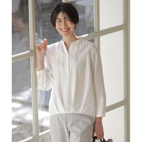 ■デザインバンドカラーに、前立て途中から釦開きデザインのブラウス。前身頃の裾にタックディテールを入れることで、コクーンシルエットの女性らしい丸みのあるデザインに仕上げました。袖のシルエットも、切替えデザインと袖口のタックディテールでボリューム感を出しています。袖丈はブレスレットレングスの9分袖丈です。