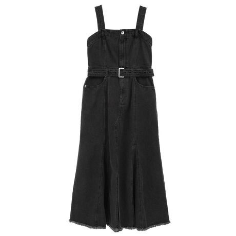 マーメイドラインが女性らしさを演出するジャンパースカート。共布ベルトでウエストマークした、スタイルアップ効果抜群の1着です。フェミニンなシルエットながらもデニム素材でカジュアルに落とし込んだデザインも魅力的。合わせるインナー次第でロングシーズン楽しんでいただけるおすすめのアイテムです。透け感[なし]