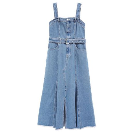 マーメイドラインが女性らしさを演出するジャンパースカート。共布ベルトでウエストマークした、スタイルアップ効果抜群の1着です。フェミニンなシルエットながらもデニム素材でカジュアルに落とし込んだデザインも魅力的。合わせるインナー次第でロングシーズン楽しんでいただけるおすすめのアイテムです。透け感[なし]