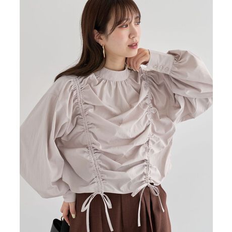 上品な微光沢感のある生地で仕立てたデザインシャツ。すっきりとしたバンドカラーに短丈のオーバーシルエット×ふんわり袖でフェミニンな雰囲気に仕上げました。フロントのリボンをドロストして、ボリュームアレンジ出来るのも魅力のポイント。合わせるアイテム次第でカジュアルからきれいめスタイルまで幅広く着こなせるおすすめのトップスです。透け感[ややあり]