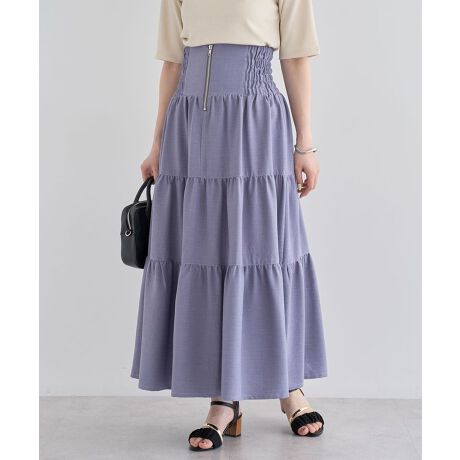 リネンのようなナチュラルな風合いの生地で仕立てたデザインスカート。裾に向かってふんわりと広がるティアードディテールがフェミニンな雰囲気です。フロントジップで楽に着脱でき、ゴムを配したウエストで快適な穿き心地なのも魅力的。トップスイン・アウトどちらでもサマ見えするおすすめのアイテムです。透け感[なし]