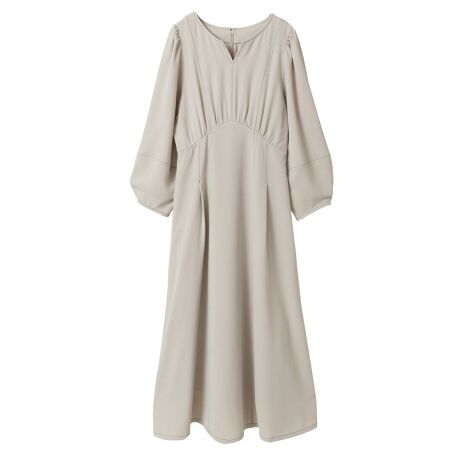 丸みを帯びたフォルムでボリュームのある袖が女性らしいワンピース。スキッパーネックが顔まわりをすっきりと演出し、肩から裾にまっすぐ入った配色ステッチでスタイルアップ効果にも期待です。ウエストゴムで快適な着心地も嬉しいポイント。デイリーにはもちろん、パーティーシーンにも活躍するおすすめのアイテムです。透け感[なし]