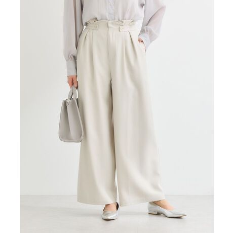 サイドベルトがアクセントになったパンツ。内側にタックを入れたややワイドなシルエットながら、綺麗な表面感の素材がすっきりとしたレッグラインを演出します。バックウエストは一部ゴムで、ストレスフリーな穿き心地も嬉しいポイント。合わせるトップスを選ばず、ロングシーズン活躍するおすすめのアイテムです。透け感[ややあり]