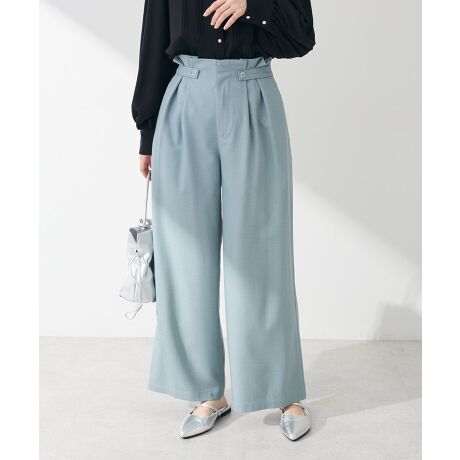 サイドベルトがアクセントになったパンツ。内側にタックを入れたややワイドなシルエットながら、綺麗な表面感の素材がすっきりとしたレッグラインを演出します。バックウエストは一部ゴムで、ストレスフリーな穿き心地も嬉しいポイント。合わせるトップスを選ばず、ロングシーズン活躍するおすすめのアイテムです。透け感[ややあり]