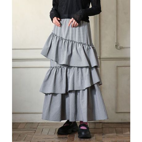 大きめのフリルが華やかな印象のデザインスカート。ティアードシルエットがフェミニンで、シンプルなトップスを合わせるだけで洒落感のあるコーディネートが完成します。ウエストはゴムで快適な穿き心地。カラーごとに印象が異なるギンガム柄にも注目です。春夏シーズン通して活躍するおすすめのアイテムです。透け感[なし]
