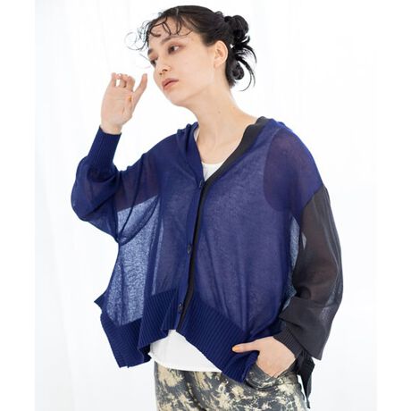 存在感のあるバイカラーながら、透け感でコーディネートに馴染みやすいニットカーディガン。