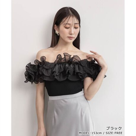 ボリュームある柔らかいシアー素材のフリルをドッキングしたニット。