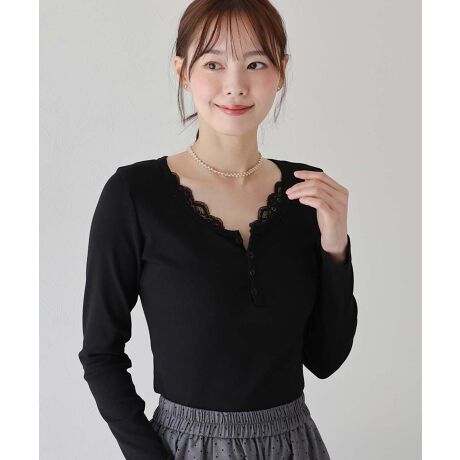 胸元にレースをレイヤードしたようなデザインが女性らしいアクセントになるカットソー。