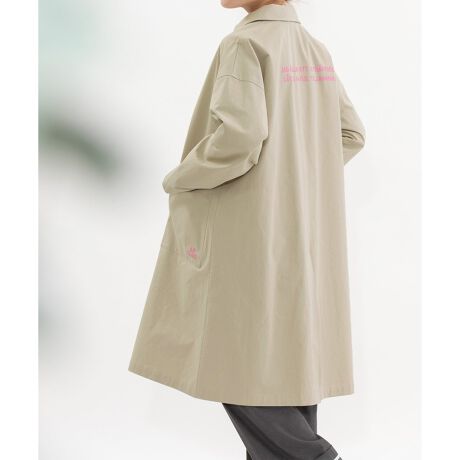 バックロゴプリント入りのさらりと羽織れるワークコート。春秋着られる厚すぎない軽めのコットンツイルを使用しています。前左ポケットにもプリントを入れてさりげないポイントに。ユニセックス対応で袖丈は長めです。内ポケットつき。
