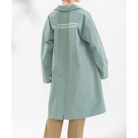 バックロゴプリント入りのさらりと羽織れるワークコート。春秋着られる厚すぎない軽めのコットンツイルを使用しています。前左ポケットにもプリントを入れてさりげないポイントに。ユニセックス対応で袖丈は長めです。内ポケットつき。