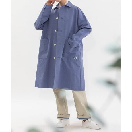 バックロゴプリント入りのさらりと羽織れるワークコート。春秋着られる厚すぎない軽めのコットンツイルを使用しています。前左ポケットにもプリントを入れてさりげないポイントに。ユニセックス対応で袖丈は長めです。内ポケットつき。